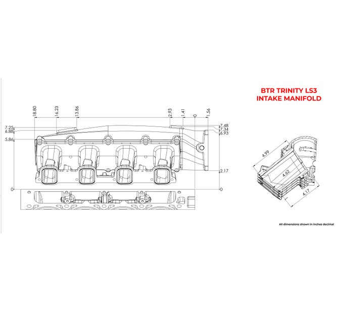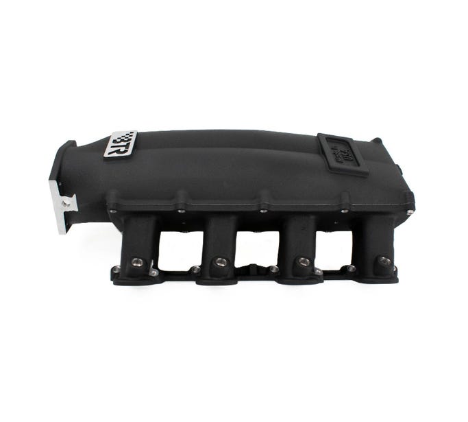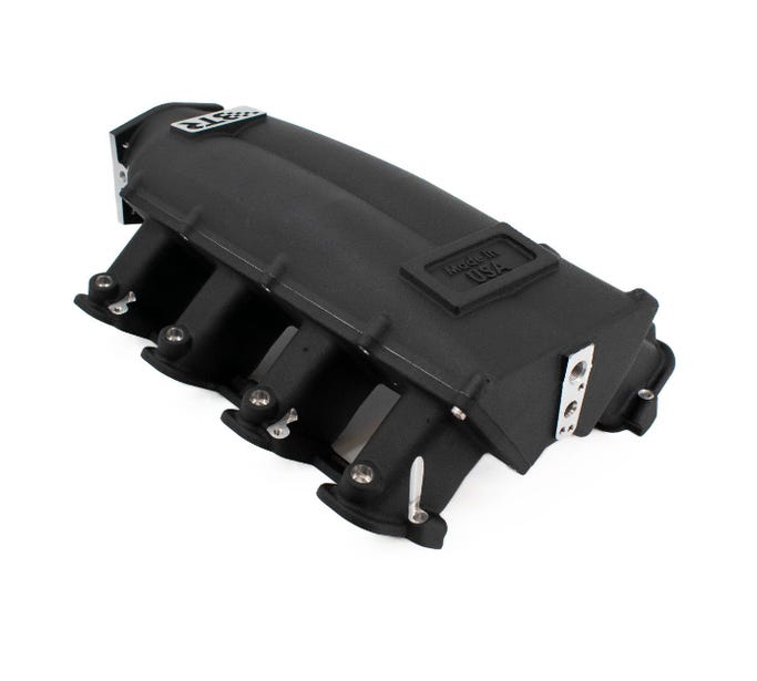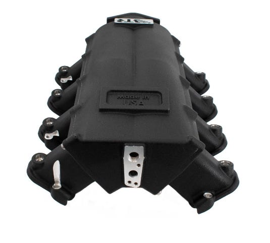 The latest offering from BTR in high quality cast aluminum intake manifolds! TheTRInity is short runner, 3-piece design that allows for the ultimate in application flexibility. It is similar in concept to billet Intakes costing thousands more. Optimum operating range is 6000-8500 rpm and is primarily intended to bridge the gap between NA and Boosted applications. It will accept DBW or cabled throttle bodies*, but yet it will fit in the tight confines of the C7, C6, C5 Corvette as well as the popular F-body platforms. The design incorporates 2 runners and an interchangeable plenum. The seal is generated by 8 entrapped orings at the runnerplenum interface, and is clamped by 20 -M6 Stainless steel socket head cap screws. The port seals are achieved SAE orings seated in a dovetailed oring groove. Both the port mouth radius and the port match is CNC machined. The TRInity incorporates 2-14 -27 NPT ports on the side of the throttle body boss and a 38-18 NPT on the rear. The manifold is available in Black Satin Texture powder coat. The manifold comes semi-assembled and includes all the hardware required to bolt it on. Runners and plenums can be purchased separately.