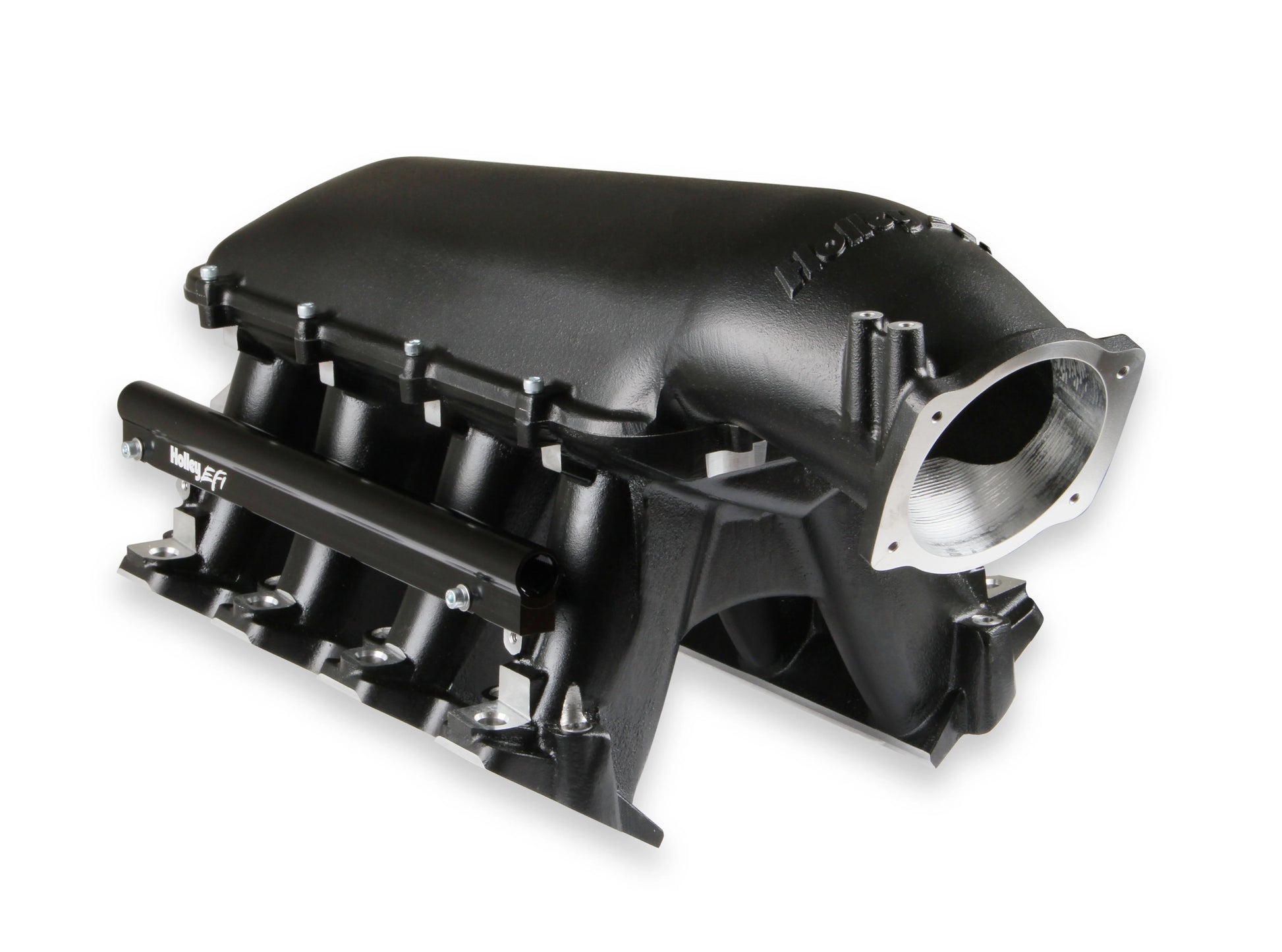 The Holley GM LS1LS2LS6 Modular Hi-Ram Intake Manifold is introduced as a cost effective alternative to fabricated sheet-metal for high-performance applications where induction system height is not limited. Coupling this Hi-Ram intake with the high flowing LS1LS2LS6 style cylinder heads has outstanding potential for NA and forced induction applications at a budget-minded cost. Aggressive, bold, race-bred styling will make bad intentions clear for drag race, muscle car, marine, off-road, sandrails, pulling trucks, track, street-rod applications and more! The base is designed to be modular in configuration to accept a wide range of carbureted and EFI tops and to be attractive to builders and fabricators as the foundation for custom induction systems. Runner length and the tapered cross-section designed to perform well for a wide range of engine configurations EFI fuel rails are machined for -8AN O-ring Fittings with passages large enough to accommodate high fuel flows and dampen pressure pulsations in the fuel system and come standard with EFI Hi-Ram kits. Cast aluminum construction. Intended for use on NA or forced induction engines in the 6.0 to 7.0+ liter range, max power at 7000-8000+RPM.